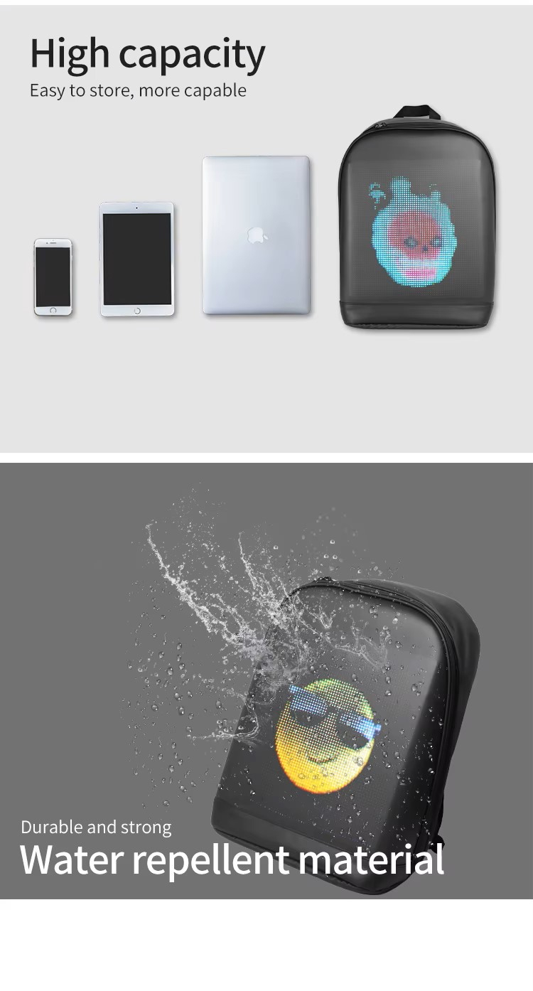 Acest rucsac smart vine cu o afisare LED care poate fi controlata prin conexiunea wireless direct din telefon sau tableta compatibil cu Android si IOS.Ecranul LED de 25x25 cm ilumineaza si face usor de vazut continutul,chiar si in conditi de lumina slaba.Rucsacul este impermeabil, astfel incat continutul va fi protejat de intemperii.